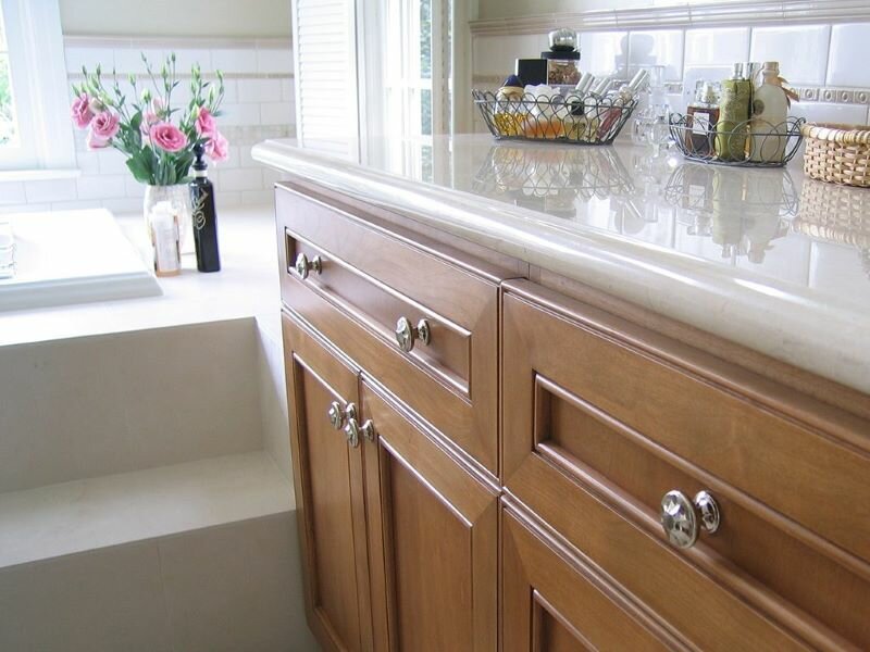 Polishing the marble tops, adding a granite piece to an outdated counter, and laminating, or painting an already laminated counter are some pocket-friendly options. Soapstone and limestone provide remodeling options without breaking the bank. Eco-friendly options like recycled glass or paper allow frequent remodeling for those who like to experiment.