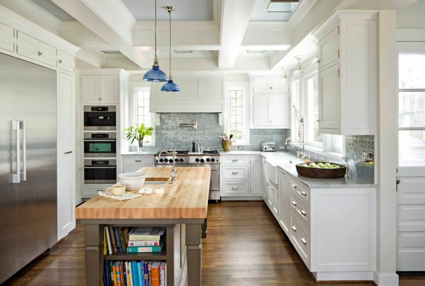 Create a cozy country look by placing a central butcher-block counter that serves a dual purpose of a workplace as well as stores pots and pans too. It saves precious space and adds to convenience and functionality.